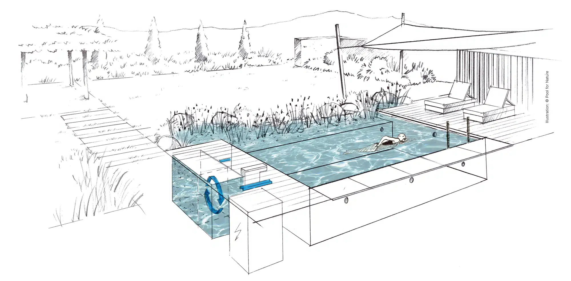 Das ausgeklügelte Pool for Nature-System ermöglicht Ihnen puren Poolgenuss ohne Chlor und ständige Wartungs- oder Pflegearbeiten. Die Wasseraufbereitung erfolgt rein biologisch mit moderner Filtertechnik, die besonders unauffällig in Ihrem Garten verbaut wird und weder getauscht noch ergänzt werden muss.
